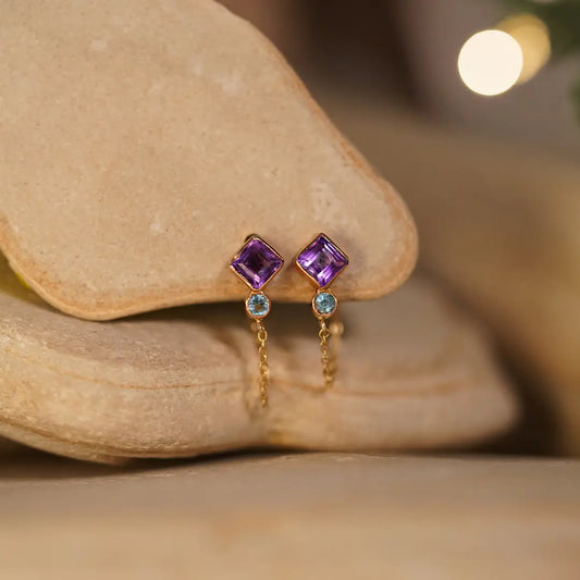Estos aretes pasantes de Oro 18k trazable combinan la espiritualidad de la Amatista, la claridad...