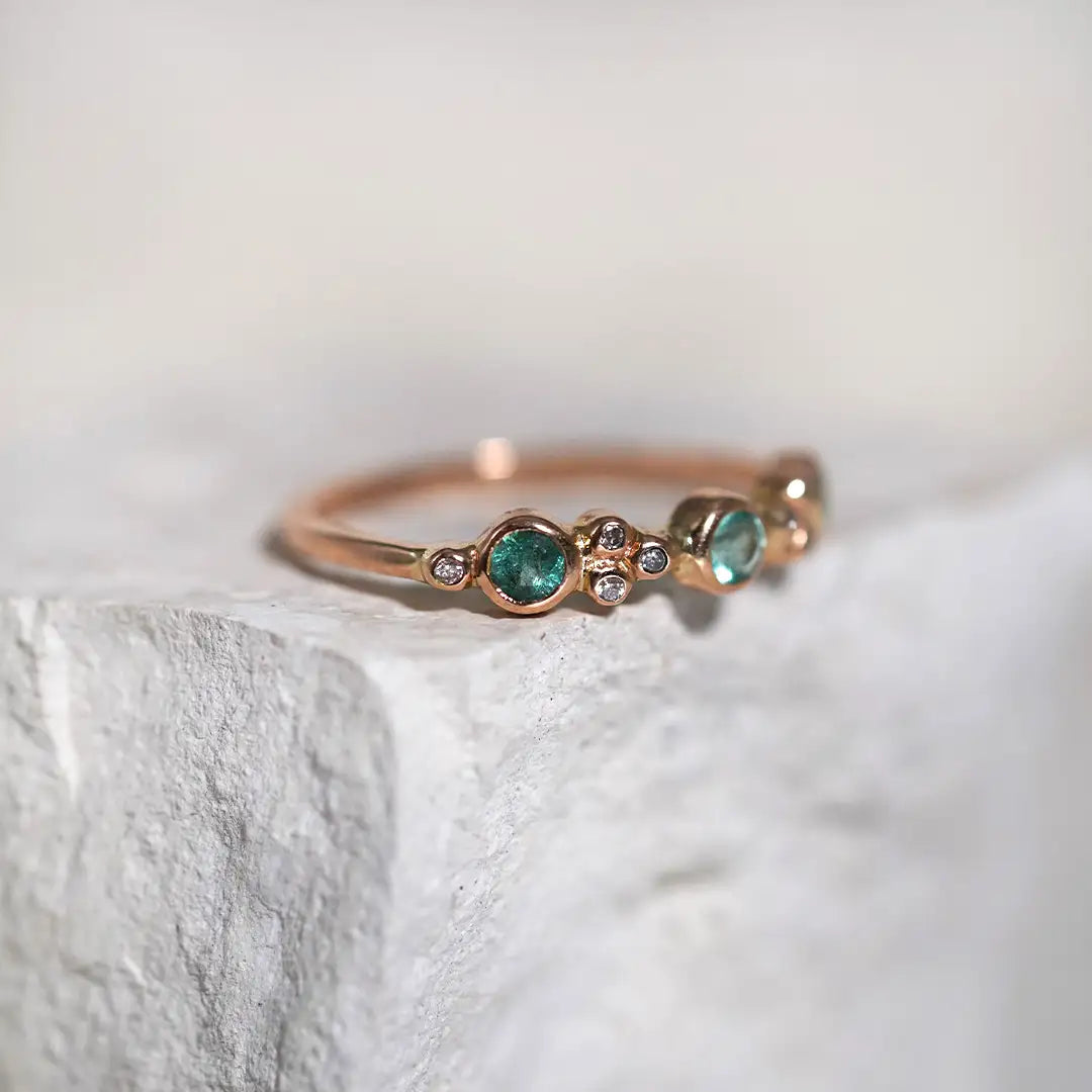 Lindo anillo en oro trazable de 18k, une la fuerza de la Esmeralda con el brillo de los Diamantes. Una joya sutil y elegante, hecha a mano en Perú. Representa armonía, esperanza y belleza consciente.