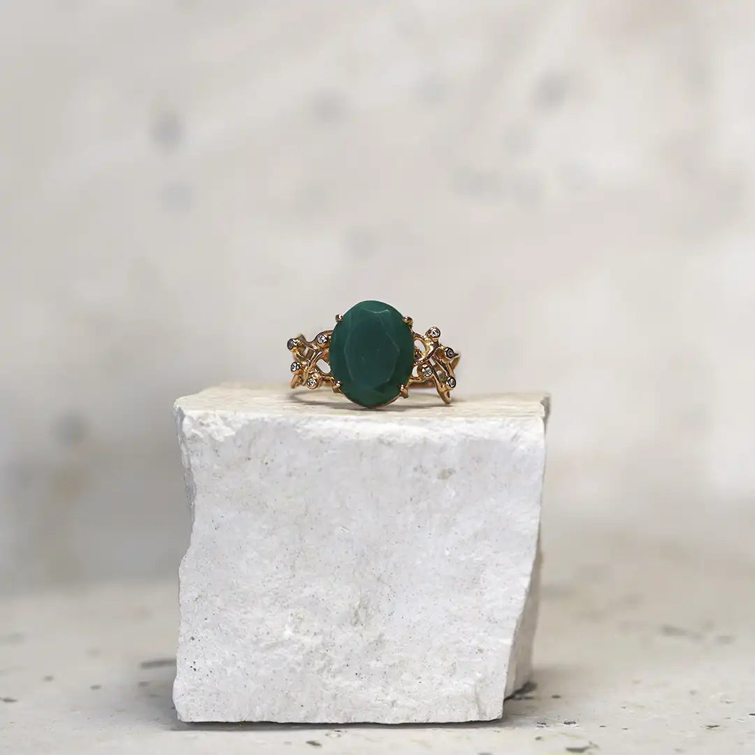 Descubre la belleza única del anillo Madre Selva Ópalo Andino Oval y 8 Diamantes, cuatro de cada lado hecho en Oro trazable de 18k. Impresiona con un estilo natural y elegante.