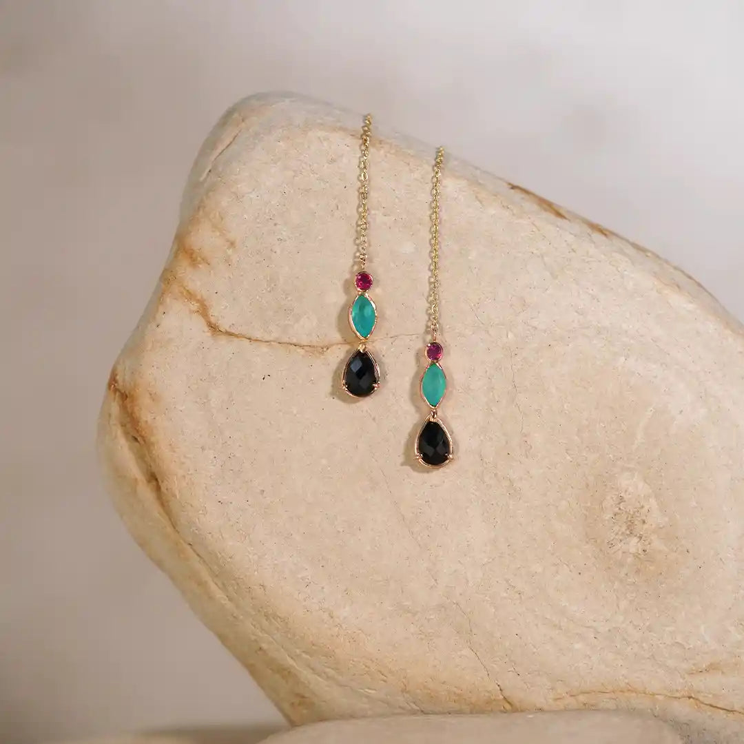 Están elaborados a mano en Oro de 18k trazable y combinan la calidez de la Rodolita, la frescura del Ópalo Andino peruano y la fuerza protectora de la Obsidiana.