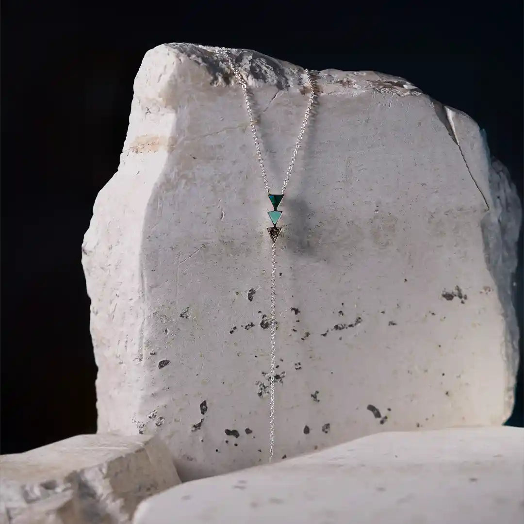 Este collar único de la colección Kené combina tres poderosas piedras naturales, la Crisocola, la Amazonita y la Pirita, cada una tallada a mano en forma de triángulo y unidas en un diseño simbólico y lleno de intención.