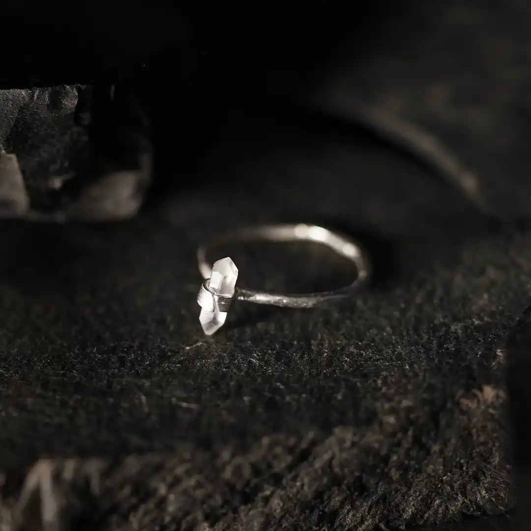 Clean, harmonious and full of intention. The Voragine Ring combines the elegance of sterling silver, shiny or blackened, with the purity of natural quartz.