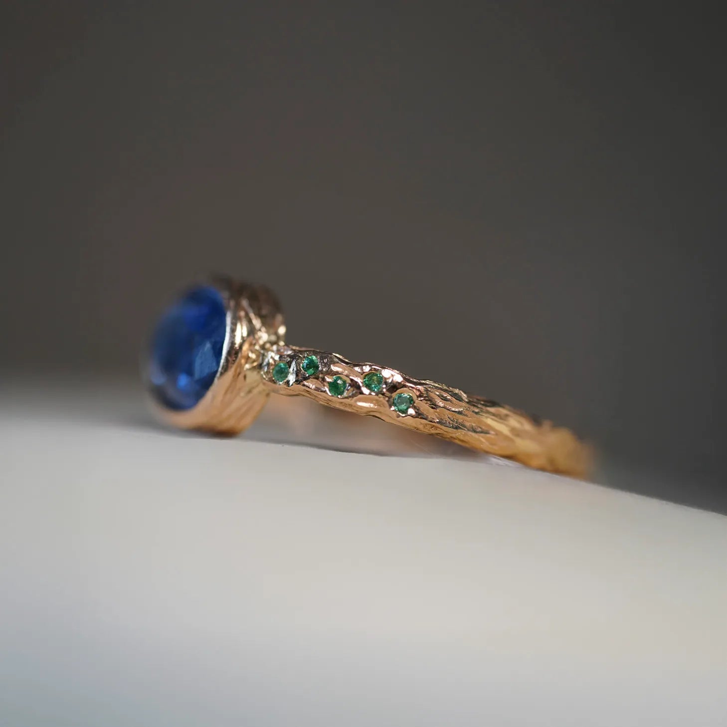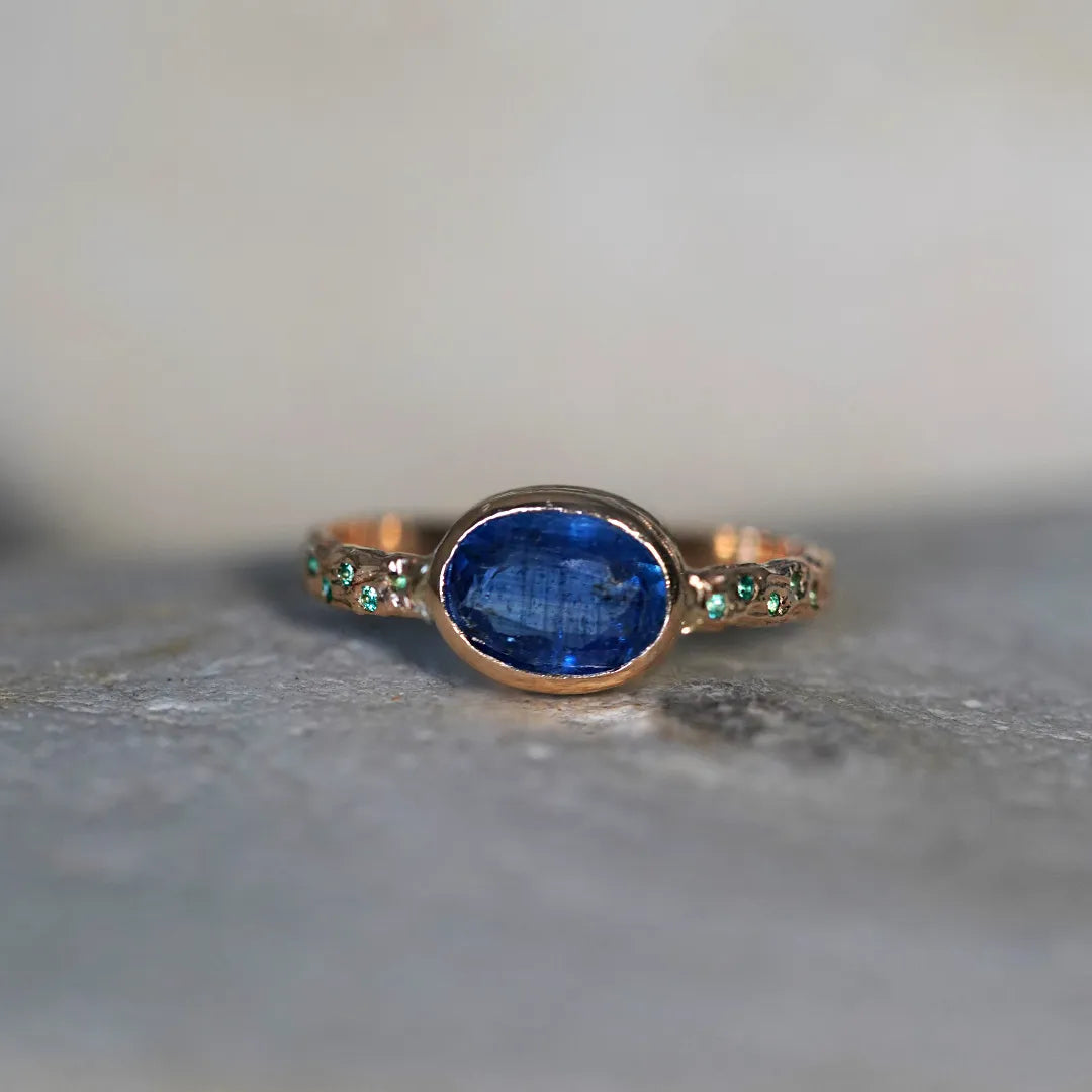 Anillo de Oro Indie con Cianita y Esmeraldas 18k, una joya hecha a mano que une el azul profundo de la Cianita con la frescura de las Esmeraldas en un diseño elegante y armónico.
